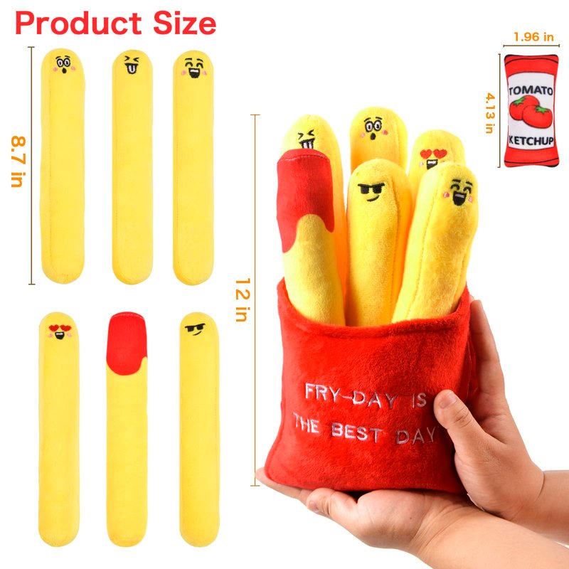 - 🍟French Fries Plush with Ketchup: This cute food plush toy includes a fries container bag, 6 removable fries with adorable emotion and a ketchup. Get your own stuffed French fries plush! Size of the plush: 7.25 x 12 inches.