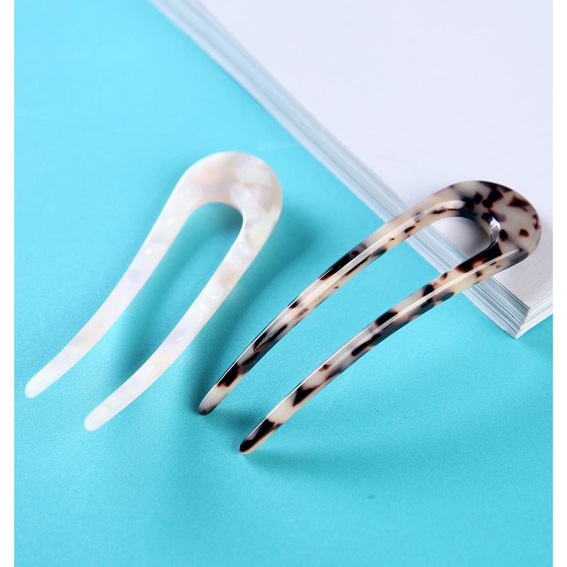 The u shaped hairpin set is a must-have hair accessory for women and girls who love to style their hair. With a tortoise shell finish, these 2-prong french style hairpins are perfect for creating updo buns and chignons. Made from cellulose acetate, they are long, large and sturdy. This set of 2 decorative hairpins is a great addition to any fashion-forward woman's collection.