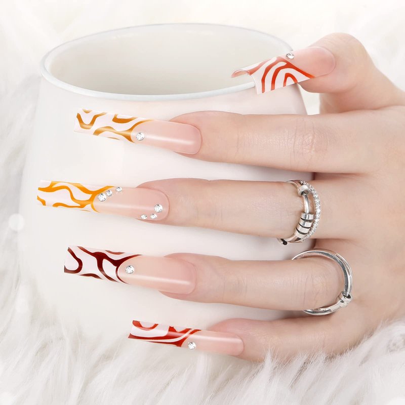 - Beautiful & Unique Design: Our french false nails are tapered square shapes with wave design and rhinestones, charming and attractive. They are made of quality acrylic material, which is safe for your skin and comfortable to touch, and not easy to break.
