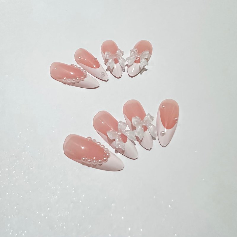 French Tip Press on Nails Almond RIICFDD Pink Fake Nails Short French Pearls Press on Nail Bow Nail Charms Designs False Nails Cute Acrylic Full Cover Glue on Nails for Women Girls 24 Pcs
