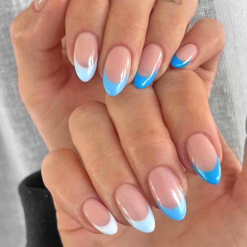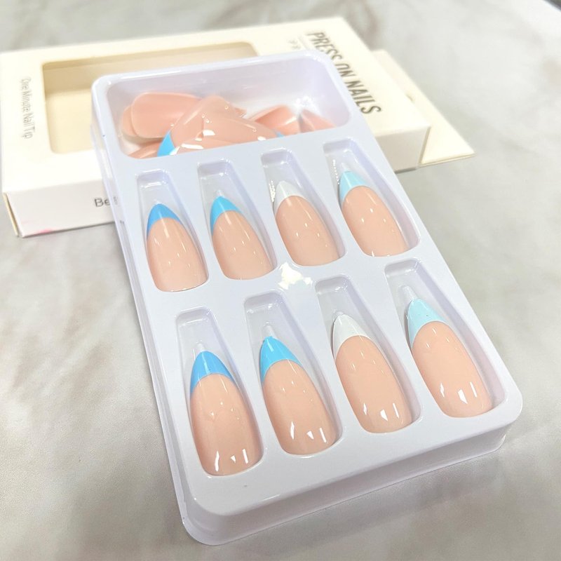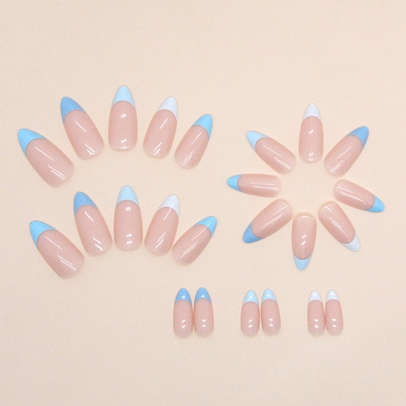 French Tip Press on Nails Long Almond Fake Nails Dark Blue Light Blue White Multicolor False Nails Glossy Nude Artificial Nails with Glue on Nails Reusable Full Cover Stick on Nails for Women