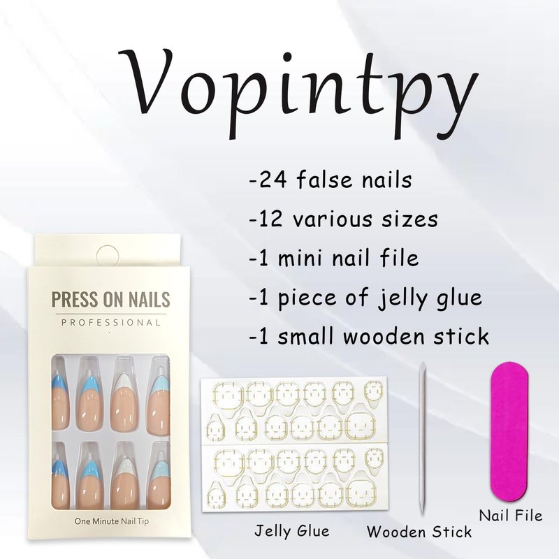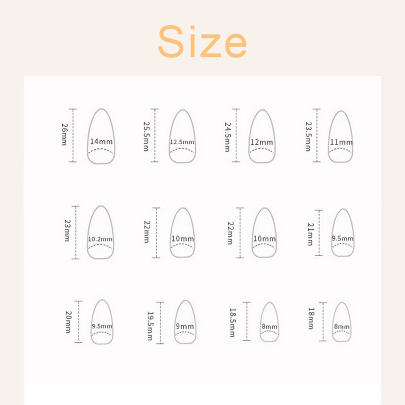 - 【Package & DIY Nails】You'll get 24 false nails in 12 sizes. 1 mini nail file, 1 small wooden stick, 1 piece of adhesive tab glue. You can safely choose a fake nail that fits your finger size and DIY your desired nail shape.