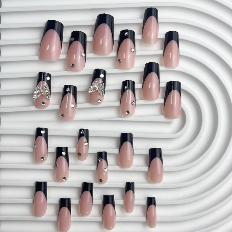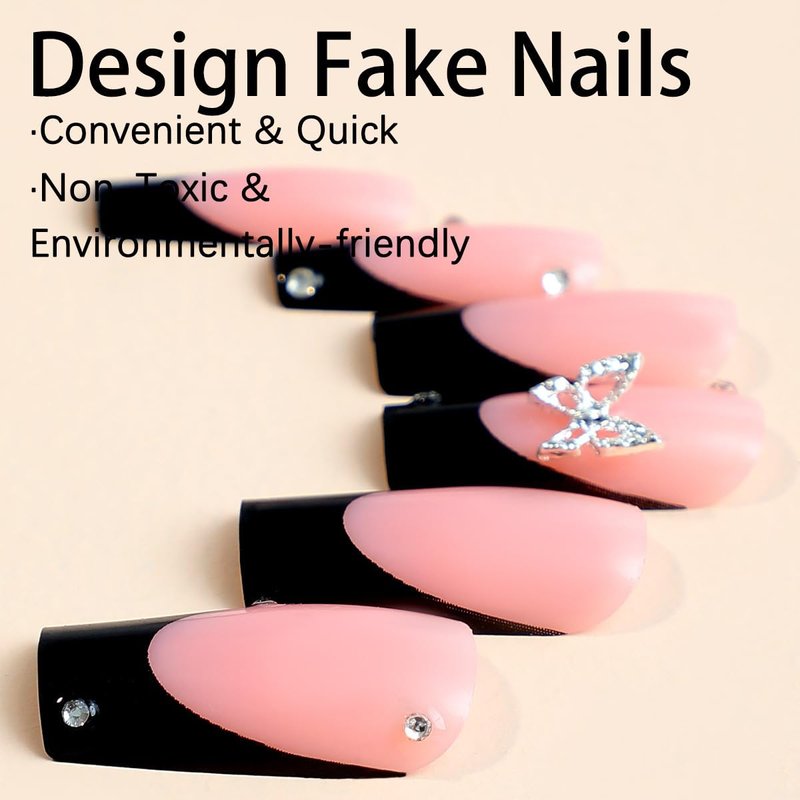 French Tip Press on Nails Medium Coffin Square Black Fake Nails 3D Butterfly Charms with Rhinestones Acrylic Glue on Nails Full Cover Pink False Nails Stick on Nails for Women Girls Manicure 24Pcs