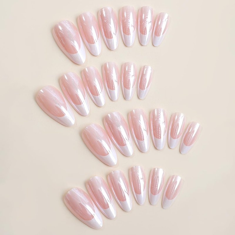 French Tips Fake Nails Medium Almond Press on Nails Chrome Press ons with Glossy Pearl Powder Full Cover Acrylic Nails with Glue on False Nails for Women Nails Decoration 24 Pcs