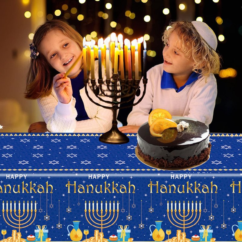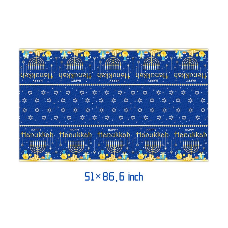 - Unique Design: Hanukkah disposable tablecloths are designed with classic Jewish elements, such as dreidels and menorahs, blue and white colors, and Hebrew patterns, adding a festive atmosphere to your Hanukkah party