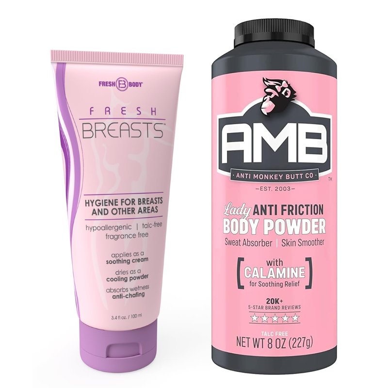 - LADIES NO SWEAT BUNDLE: (1) Fresh Breasts, 3.4 oz.- Unscented and (1) Lady Anti-Monkey Butt Anti Friction Body Powder for women, 8oz - Stay dry and sweat free from top to bottom