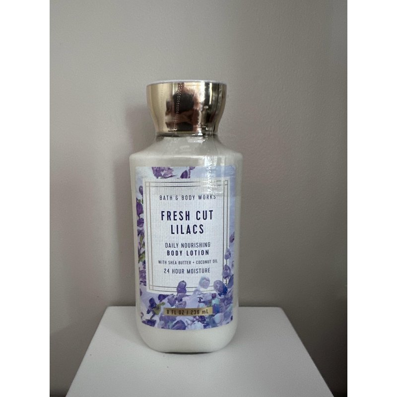 Bath and Body Works Fresh Cut Lilacs Lotion. 8 Oz. Scent: lilac, dew and spring air. Ingredients: shea butter and coconut oil. Dermatologist tested (Bottle Artwork May Vary as Seasonally Refreshed by Manufacturer).