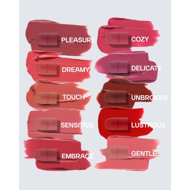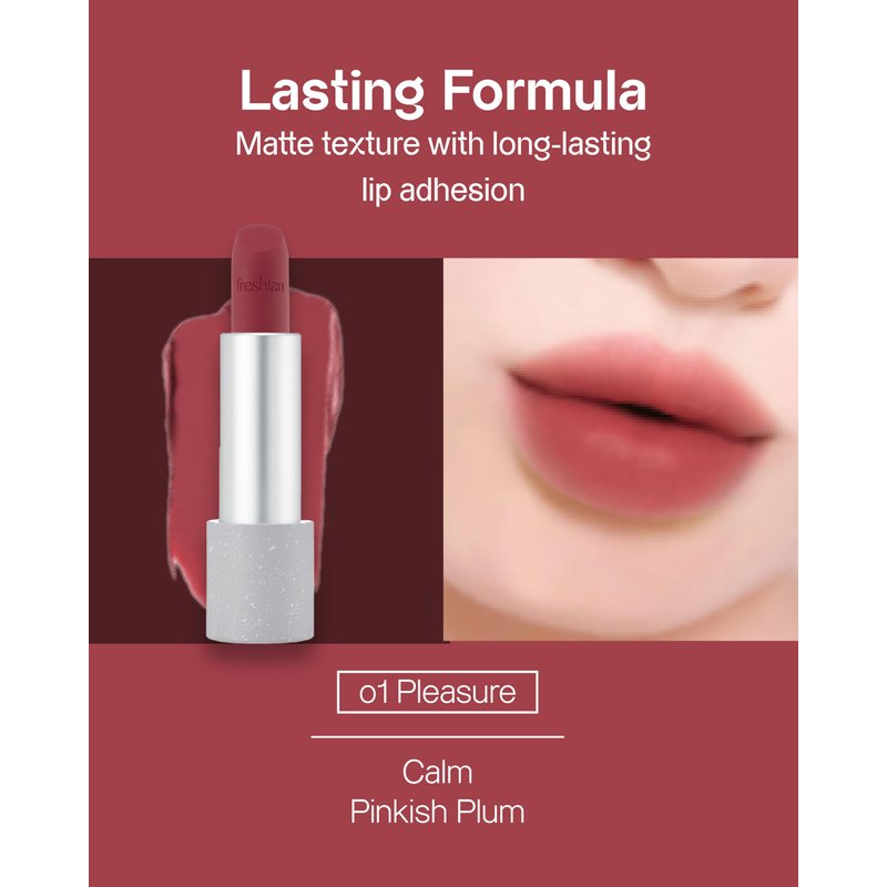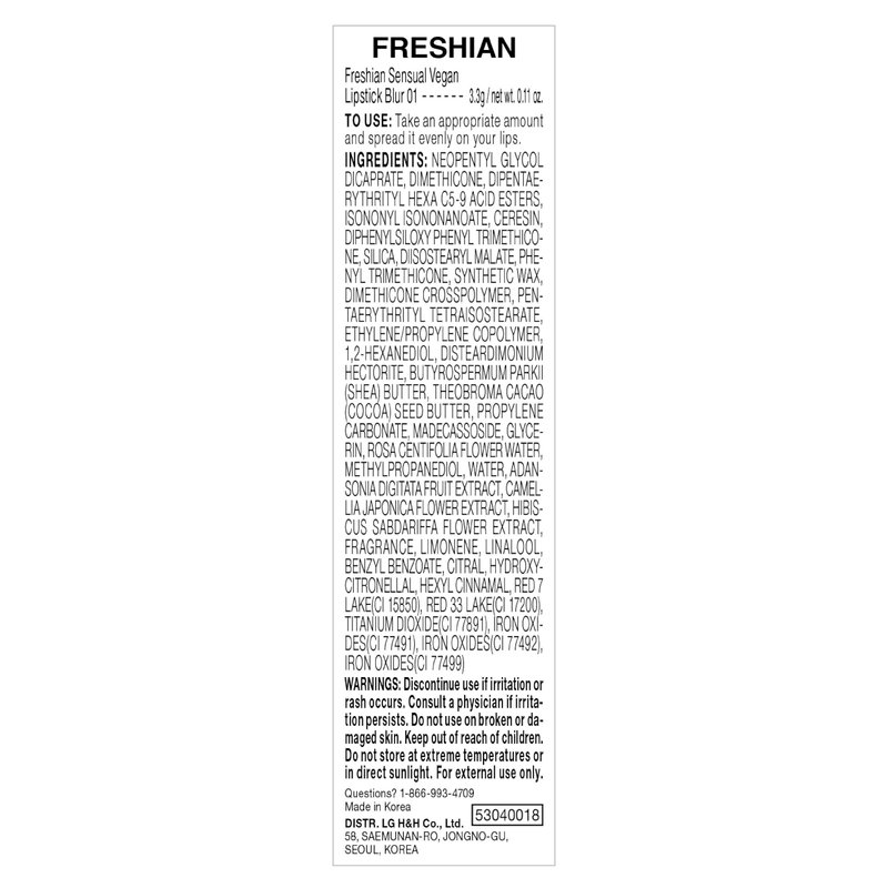 - FRESHIAN SENSUAL VEGAN LIPSTICK BLUR (01 Pleasure, 3.3g/0.12oz) - This lipstick provides a matte, yet smooth, lightweight finish that enhances your natural beauty while keeping your lips nourished and comfortable all day. Enriched with Flower Complex, a blend of hibiscus, camellia, and Provence rose extracts, it ensures your lips stay lively and moisturized.
