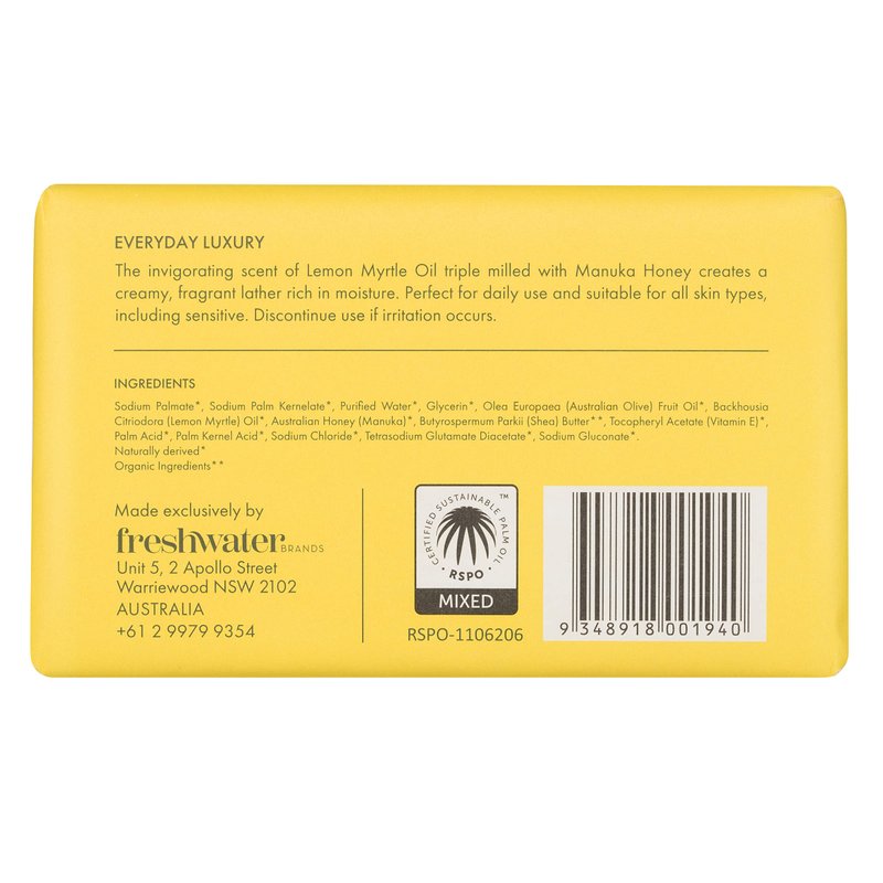 Triple Milled with Organic Shea Butter: Lemon Myrtle Oil is a natural antiseptic, which helps to alleviate skin irritations, while Manuka Honey helps soothe and balance the pH of your skin. This Body Bar will invigorate your senses and leave your skin feeling refreshed. 100% naturally derived. Situated on the Mid-North Coast of NSW, Freshwater Farm is our family owned and operated farm producing a variety of distilled essential oils, from our farm to your skin. Everyday Luxury: The invigorating scent of Lemon Myrtle Oil triple milled with Manuka Honey creates a creamy, fragrant lather rich in moisture. Perfect for daily use and suitable for all skin types, including sensitive. Follow the journey (at)freshwaterfarm_aus as we continue to add aromatic and functional botanicals to our plantation for the benefit of your skin. Not tested on animals. RSPO: Certified sustainable palm oil. Mixed. Australian made & owned.