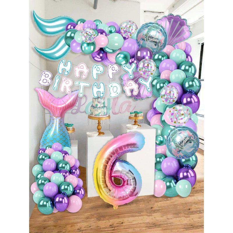 - What’s in the package: Come with 125pcs totally,including 1pcs number 6 foil balloon.2pcs HAPPY BIRTHDAY banners.1pcs sea-maid tail foil balloon.2pcs shell foil balloons.2pcs s-shaped foil balloons.85pcs 10” balloons(metallic green/light green,metallic purple/light purple/light pink,17pcs of each color).20pcs 5” balloons(metallic green/light green,metallic purple/light purple/light pink,4pcs of each).6pcs 10” confetti balloons.4pcs balloons tools