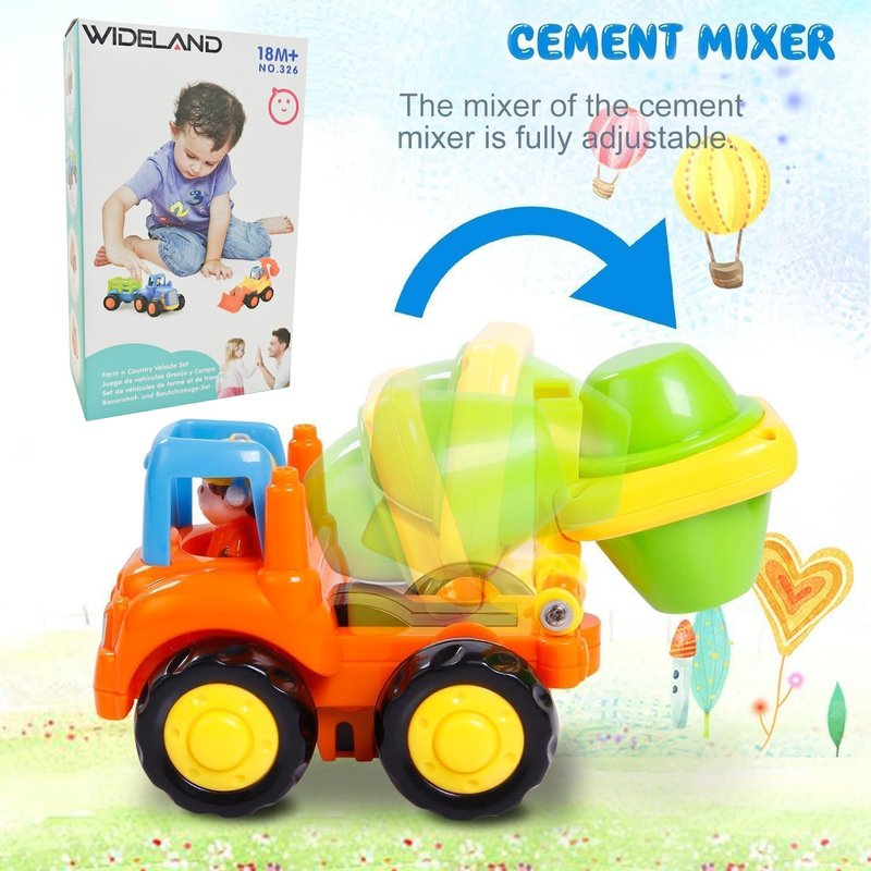 Set of 4 Friction Powered Toy Trucks for ages 18 month, 2, 3, 4 Toddlers. Perfect for enthusiastic little hands. Made of high quality, sturdy plastic. Long lasting friction power. Includes: cement truck, dump truck, bulldozer and farm tractor with wagon.Features: 4 Types of Trucks : bulldozer, mixer, dumper truck, tractor Material: ABS Made of high quality, sturdy plasticFriction Powered, Bright, Colorful Tractor comes with detachable trailer Bulldozer: the arm of the bulldozer can move up and down, each joint of it can move flexibly to form differently. Farm tractor: Fun caroon driver will amuse your baby, the carriage can be jointed to the main body to carry small items,and the rear door can be opened or closed exercising the flexibility of children's hands. Dump truck: rotating car hopper can discharge the building materials conveniently. Cement truck: the mixer can rotate up and down and discharge the cement, letting kids know the principle of mechanical automation, cultivating their creativity and manipulative ability. Distinguishing different names and of the trucks, cultivate children's observation and attention. Different shapes and colors of trucks help kids to recognize new thing and stimulate their visual development. Exercising the coordinated capacity via the inertia of the trucks when playing.