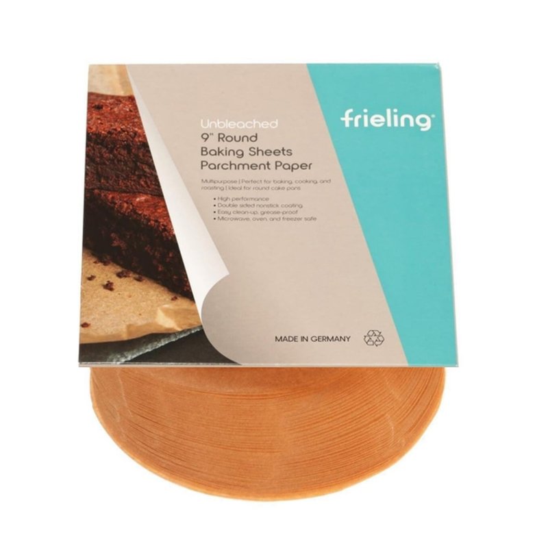- UNBLEACHED PARCHMENT PAPER: This Frieling Parchment Paper is a box of 50 pre-cut round sheets. Each sheet measures 9" diameter. Perfect use for a standard sized cake for baking, roasting or cooking. Oven safe to 450°F/230°C the sheets are high density with excellent wet strength. Helps keep clean-up a breeze by using each sheet more than once!