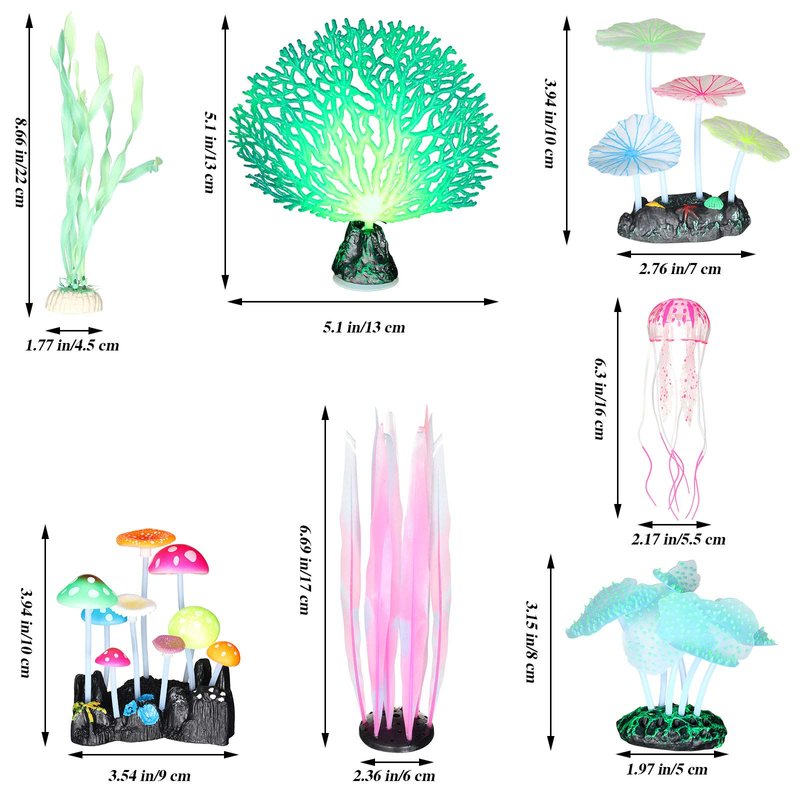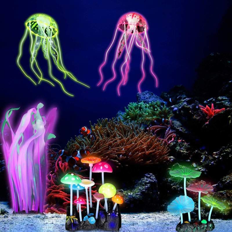 - Package includes: 1 piece green glowing kelp with a ceramics base, 1 piece pink glowing kelp, 1 piece green glowing anemone,1 piece glowing lotus leaf rockery, 1 piece glowing mushroom rockery, 1 piece green simulation coral, and 2 pieces glowing jellyfish in pink, yellow, sufficient quantity to meet your different tank decoration needs