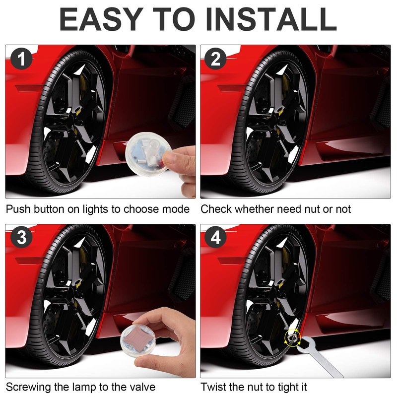 - What to Get: you will receive enough amount of solar energy flashing car tire lights and wrench, you can use one light to decorate your car and the rest as a backup, or to share some of them with your office colleagues, family members, lovers, classmates and so on