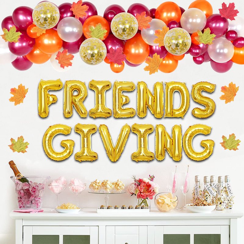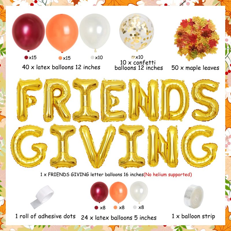 - Friendsgiving Party Decorations: The package includes 66 packs balloons: 56 latex balloons (burgundy, orange, white), 10 confetti balloons, 1 balloon tape strip and 1 roll of adhesive dots. Besides these, you will get 1 FRIENDS GIVING letter balloons, 50 maple leaves to decorate your friendsgiving party.