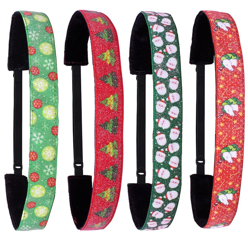 - 4 Christmas headbands made with stylish textured grosgrain ribbon, Christmas themed designs, festive glitter overlay, and comfortable non slip velvet lining to keep your hair accessory in place;