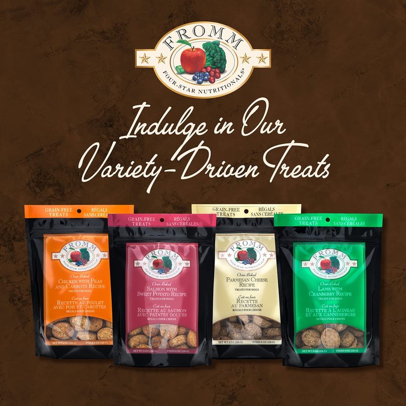 About Fromm Four-Star Nutritionals Chicken with Peas & Carrots Recipe: These premium dog treats are made with chicken, whole peas, and carrots. Free from artificial colors, flavors, or preservatives. Only 12 calories per treat. Our dog biscuits are made for all breeds and ages, from Great Danes to Chihuahuas, puppies to seniors, and every breed and stage in between. Resealable packaging. About Fromm Family Foods: We're a fifth-generation family-owned-and-operated pet food company based in Wisconsin. We use high-quality meat and fish, Wisconsin cheese, farm fresh produce, and whole grains from vetted suppliers. Ingredients: Chicken, pea flour, potato flour, tapioca, whole peas, chicken fat (preserved with mixed tocopherols), tomato pomace, cranberries, sweet potatoes, carrots, apples, split peas, green beans, green bell peppers, celery, beets, parsley, lettuce, spinach.