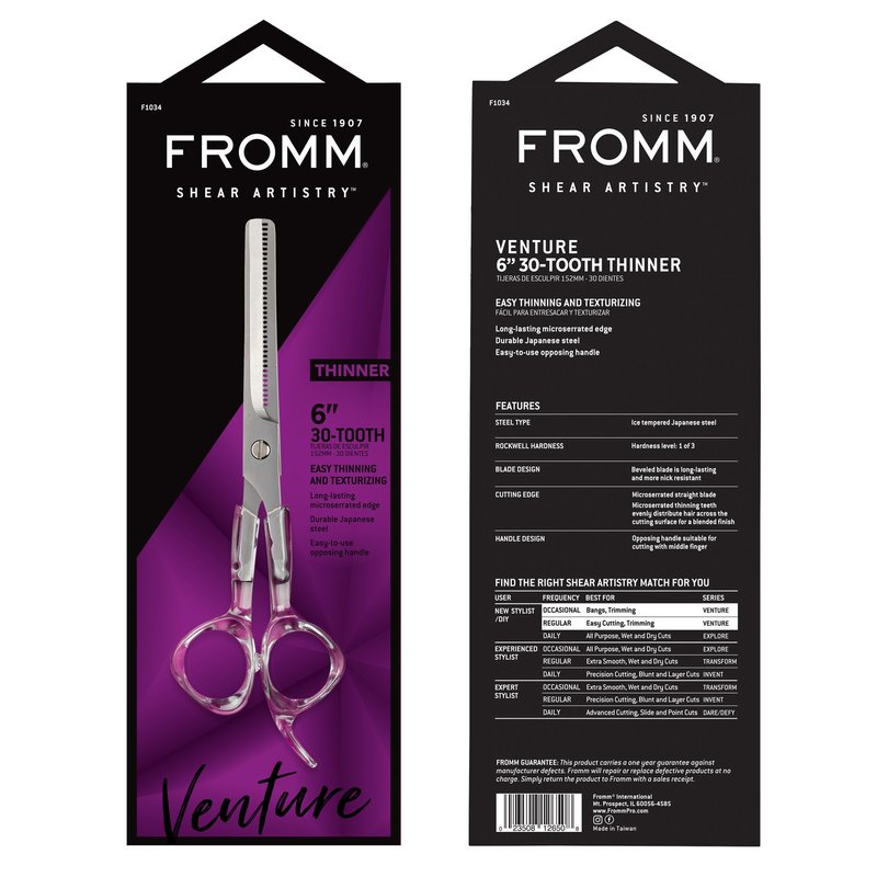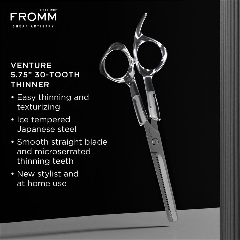 Fromm Professional Venture 5.75" 30-Tooth Easy Hair Thinning & Texturizing Shears in Clear & Matte Silver Japanese Steel Scissors with Beveled Blade for New Salon Stylist & DIY Home Use