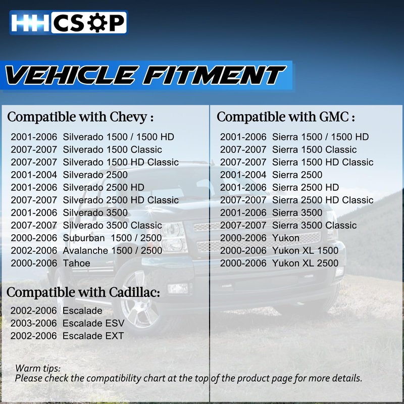- Compatibility: Front Left Driver Side Door Lock Latch Actuator Motor for 2001 2002 2003 2004 2005 2006 Chevy Silverado 1500 2500 3500 1500 HD 2500 HD, 2007 Silverado 1500 Classic / 1500 HD Classic / 2500 HD Classic / 3500 Classic, 2000-2006 Suburban 1500 2500, 2000-2006 Tahoe, 2002-2006 Avalanche 1500 2500丨2002-2006 Cadillac Escalade ESV EXT丨2001-2006 GMC Sierra 1500 2500 3500 1500 HD 2500 HD, 2007 Sierra 1500 Classic / 1500 HD Classic / 2500 HD Classic / 3500 Classic丨2000-2006 Yukon XL 1500 2500.
