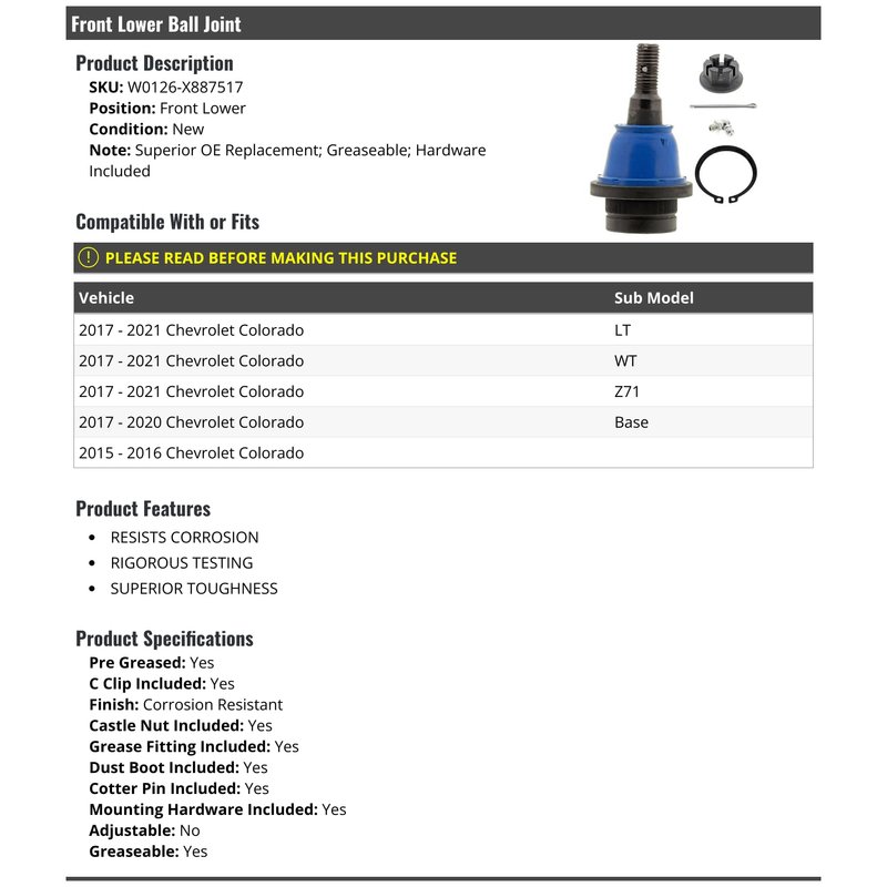 Front Lower Ball Joint - Compatible with 2015-2021 Chevy Colorado