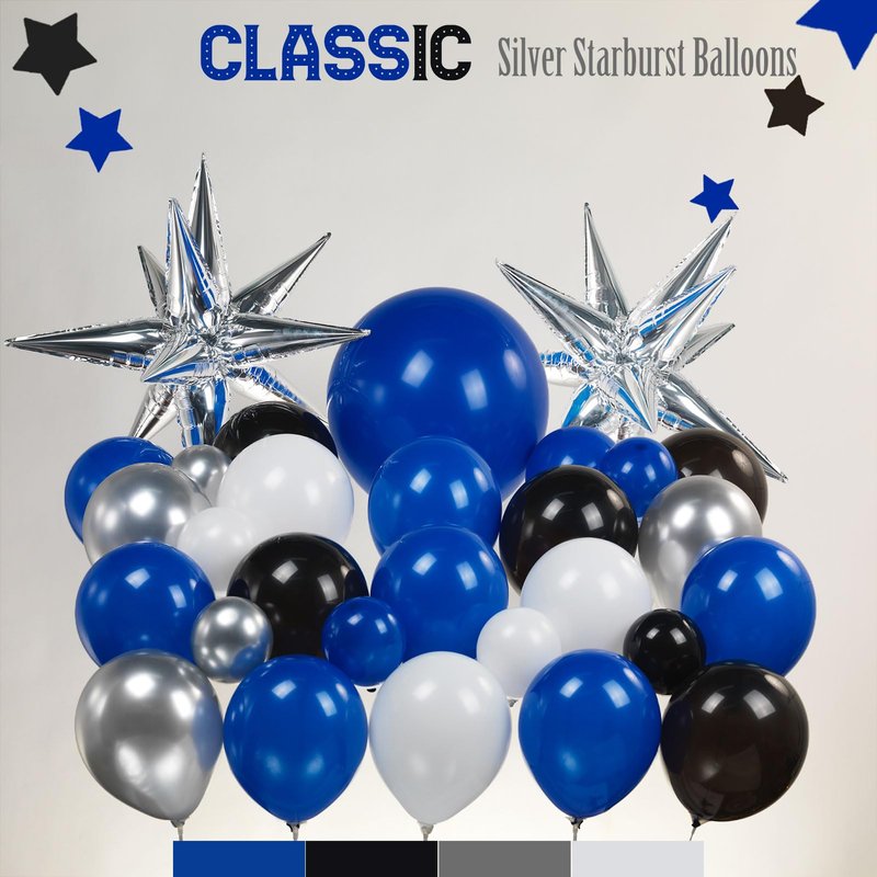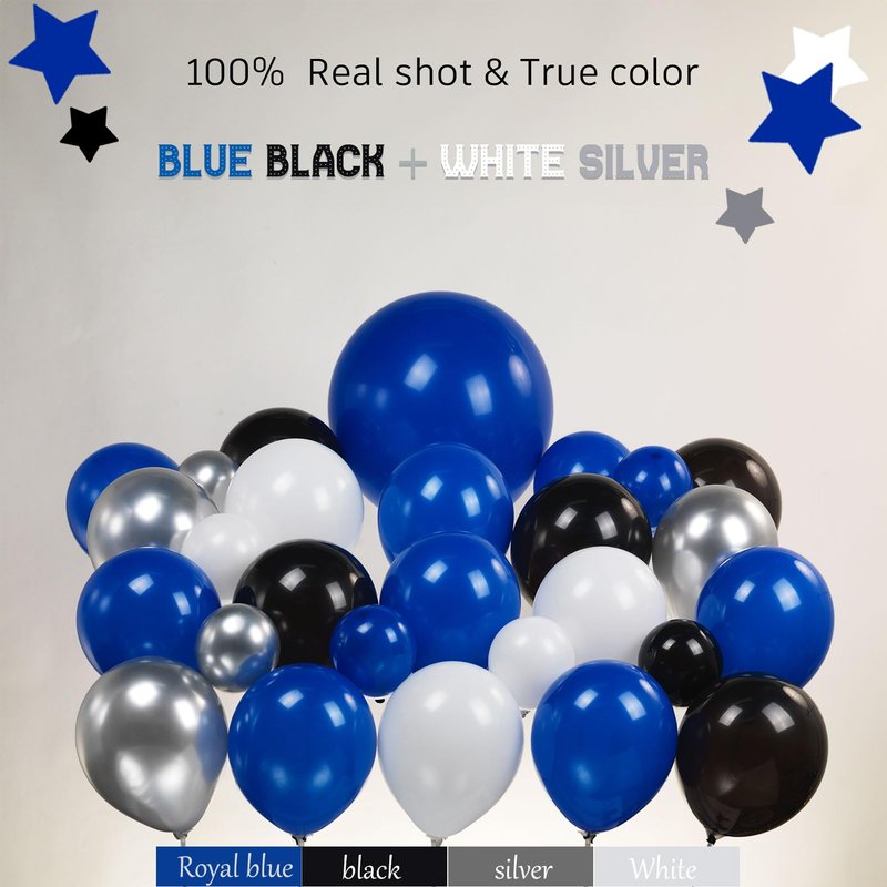 - 【Classic Blue silver Balloon Arch Kit】Includes the following 119Pcs 5/10/12/18 inch balloons in different sizes. We chose Blue black white silver rubber balloons as the theme palette, and mylar star and (glue dots/plastic arches/ribbons) tools ,which is very suitable outdoor and indoor theme parties, adding beautiful colors ,it’s suitable for boy men birthday party