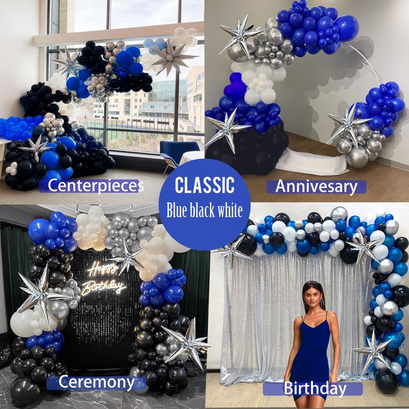 - 【For many occasions 】Blue and black white silver balloon arch garland is perfect for wedding or birthday party, graduation, holiday, baby shower, first birthday party, bridal shower, engagement, anniversary celebration, indoor or outdoor and Holiday party decorations, can be hung as backdrops, balloon garlands, balloon arches, centerpieces, tables, stairs