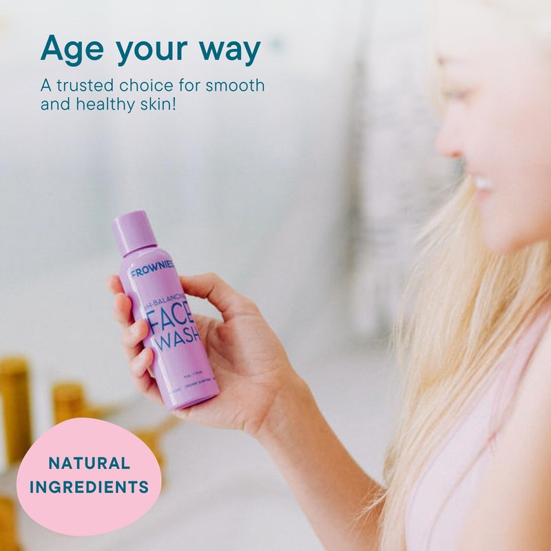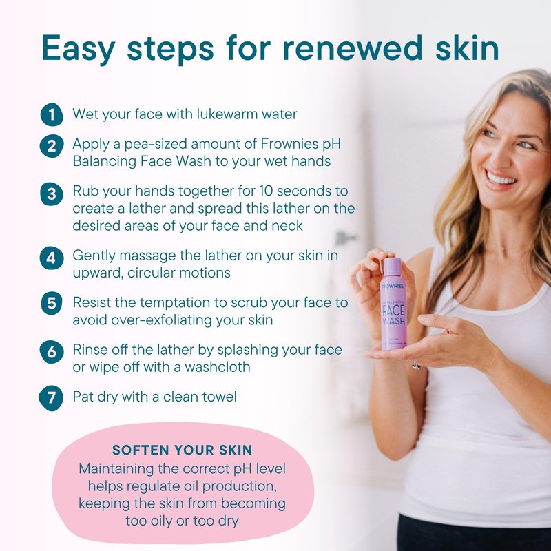 - EASY APPLICATION - Opt for lukewarm water to wet your face. Apply a pea-sized amount of Frownies pH Balancing Face Wash onto wet hands, lather, and gently massage on face and neck in circular motions. Rinse and pat dry. Repeat for makeup removal