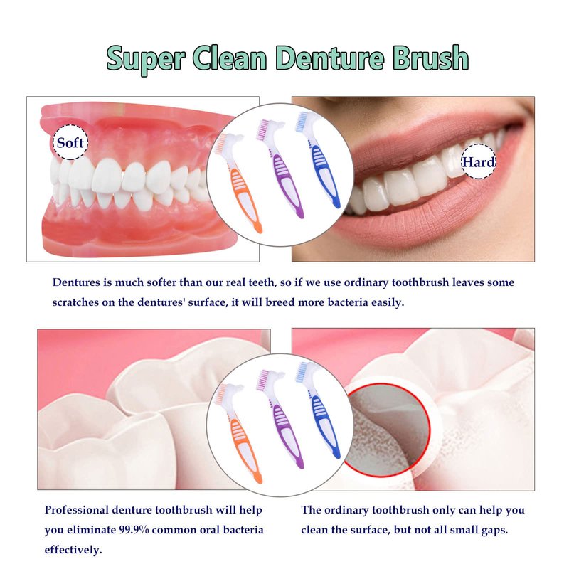 - Moderate Bristle: rigidity and elasticity soft brush, not easy to deform; our brush is moderate soft, great for cleaning dentures, won't worry it would damage the denture