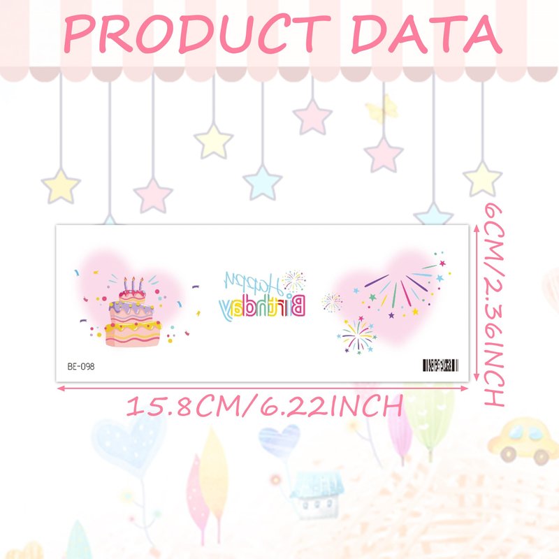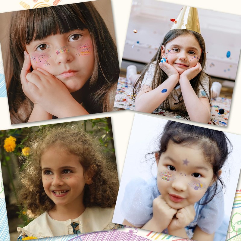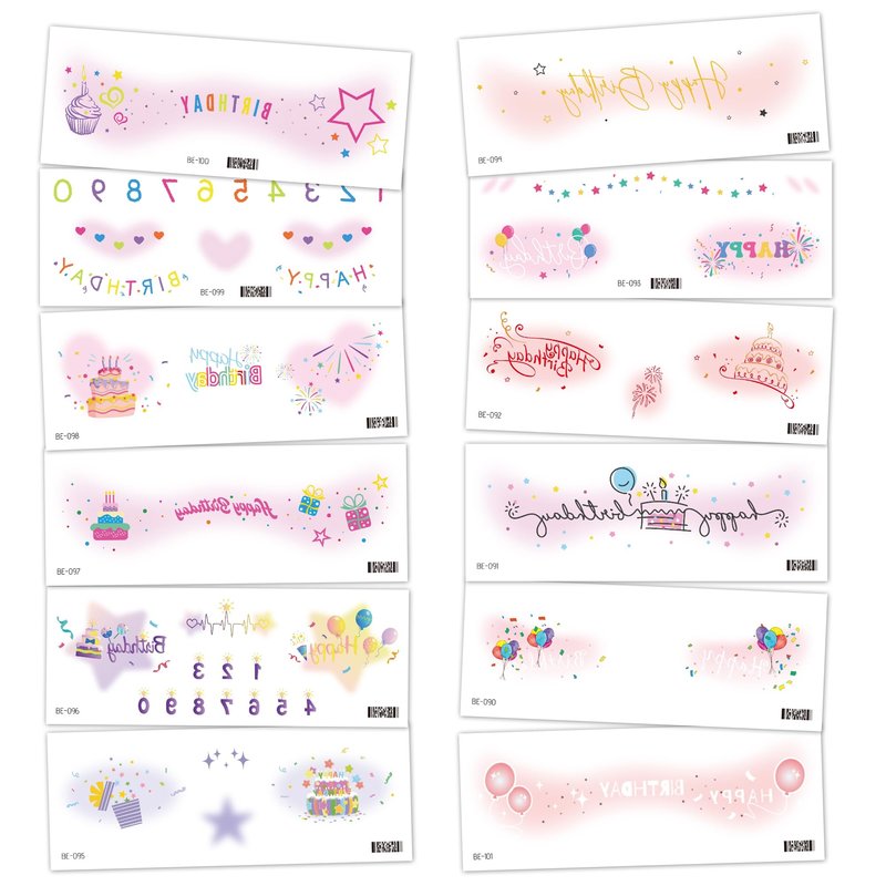 PACKAGING INCLUDES: 1 set (12 sheets) birthday party face tattoo stickers.