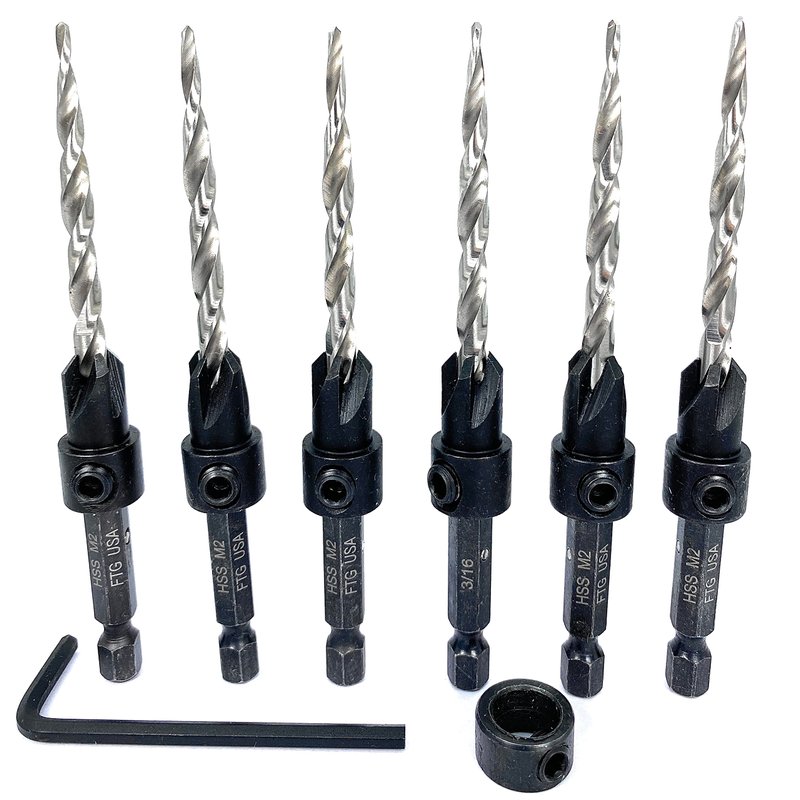 FTG USA Countersink Drill Bit Set 6 Pc #10 (3/16") Wood Countersink Drill Bit Pro Pack Countersink Set, Tapered Countersink Bit, 1 Stop Collar, Hex Wrench, Woodworking Tools