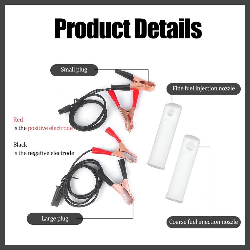 - [Working principle]: The electric port of the fuel injector is connected to the 12V power supply through the cable. When the current is switched on, the solenoid valve in the nozzle is opened. At the same time, the cleaning liquid is washed through the white tube, and then cleaned through the syringe.