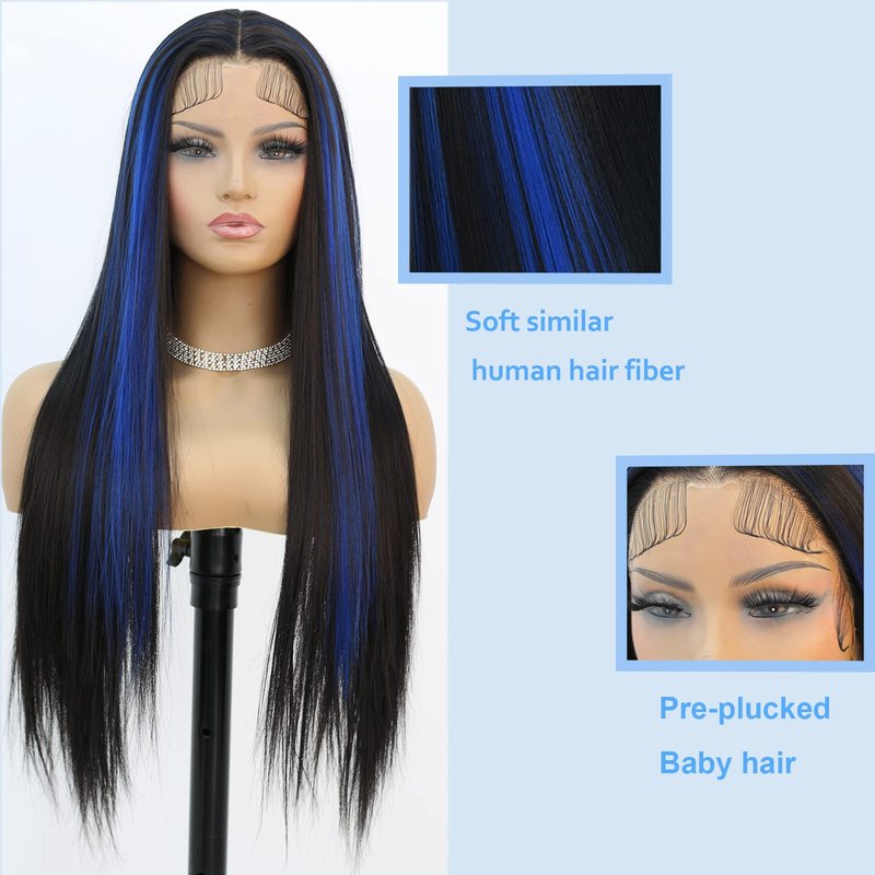 Fugady Blue Highlight Wig Long Straight Lace Front Wig Black and Blue Synthetic Lace Front Wigs for Black Women Pre Plucked with Baby Hair Heat Resistant for Daily Use 24 Inches(Synthetic| 13 * 4 Lace Frontal)