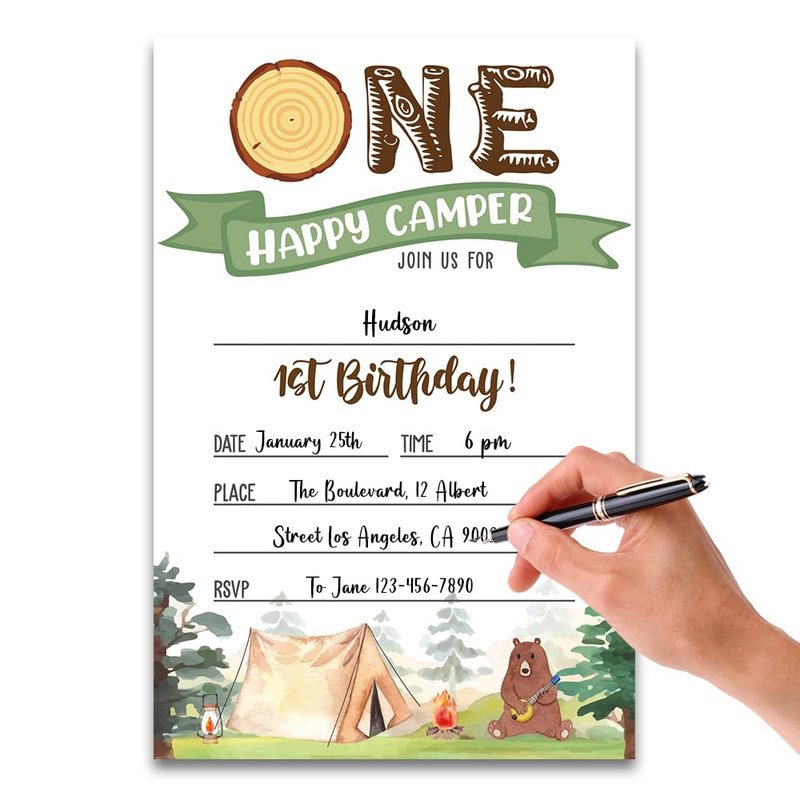 FujLoy Happy Camper Invitation, One Happy Camper Birthday Invitation, Camper Party Invitations cards.(069)