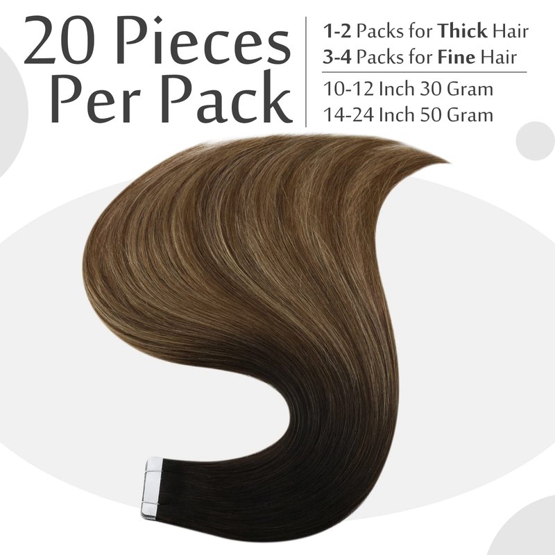 Ombre Balayage Tape in Hair Extensions is the Symbol of Full Shine Hair. If You Are Tired Of Basic Pure Color, Choose Ombre Balayage Color Is A Correct Choice, Have A Try:)Product Details Hair Material:100 percent Real Hair Texture: Straight, and have a natural wave when wet or left to air dry or diffused.Tape: America White Tape Tape size: 0.8cm * 4cmSet: 2.5g/pcs, 20 pcs/package, 50g/package Notice Before Order1.Quantity Needed: 150-250 Grams, 3-5 Packs are recommended for whole head. If You Are Short Hair, Reduce 1 Pack. 2.About Style: Our Human tape in hair extensions are just like your own hair and can be styled, curled or straightened as desired. Daily DIY will reduce the life span of tape ins, please use more nutrition.3.About color: Our Tape Hair can be colored darker but not lightened. always test a small piece when you dye.4. About wash: Wash Your Own Hair Without conditioner When it’s first time to apply in . Don't wash the hair at least 72 hours after the attachment, Everyday Wash is not good for your extensions. Use sulfate free shampoo and conditioner on the hair.5. About Care: We suggest you to use the rub in oil to revive dry hair; Sleep with a silk cap or buy a silk pillowcase will protect the hair.6. About Usage: Hair Can be reused with replace tape. And we suggest to adjust the tape every 2-4 weeks to keep the hair stay well.Find Beauty And Confidence With Full Shine Hair.