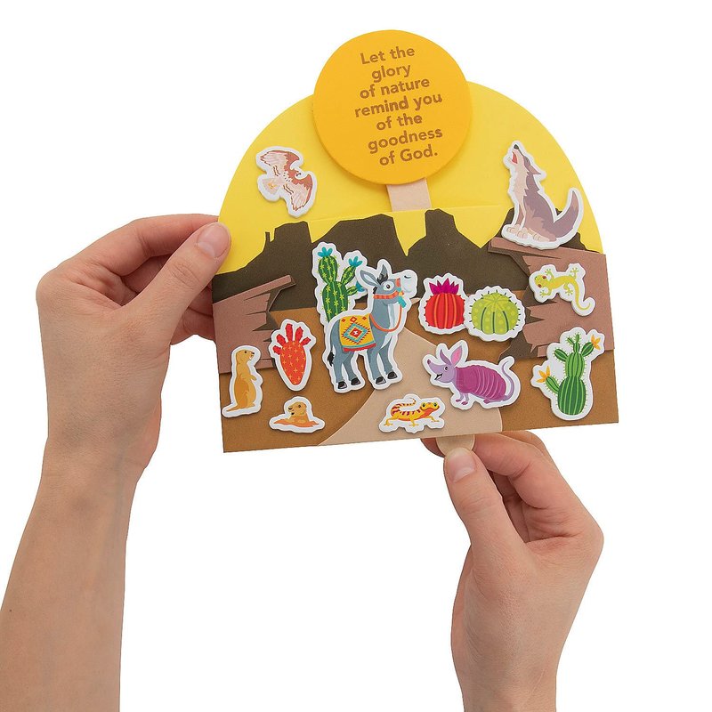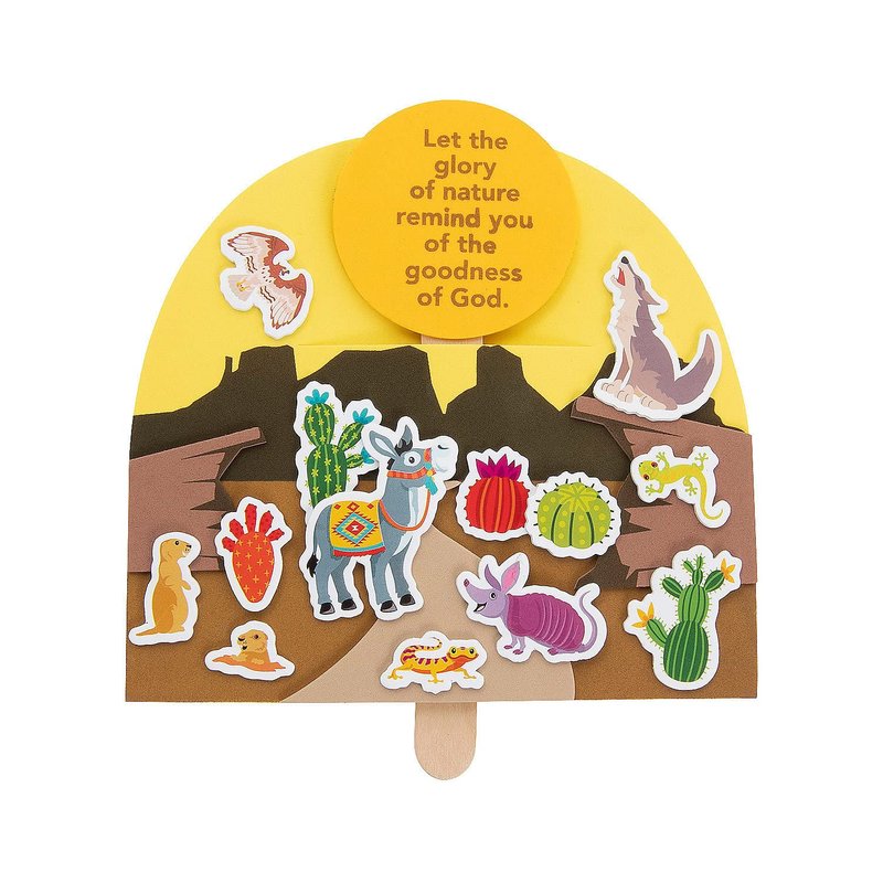 - Help Sunday School kids reflect on the glory and goodness of God with this colorful craft kit that becomes an interactive pop-up kids can play with. A simple peel-and-stick craft kit that works great for Sunday School or VBS, this craft has happy desert characters and faith-filled messaging that celebrates the goodness of God. Includes self-adhesive foam pieces and wooden craft sticks. 7" x 6 1/2" Makes 12. All craft kit pieces are pre-packaged for individual use. Kits include instructions.