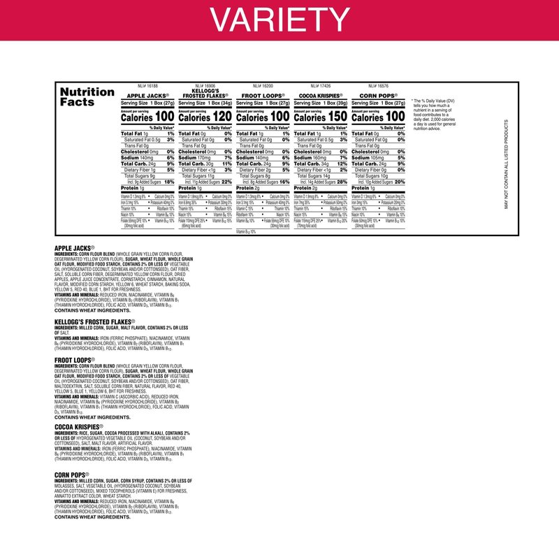 - A fun breakfast cereal variety pack containing your choice of Kellogg's Frosted Flakes, Apple Jacks, Froot Loops, Cocoa Krispies, and Corn Pops