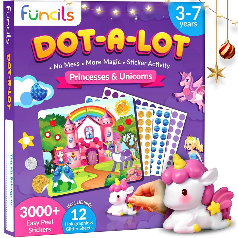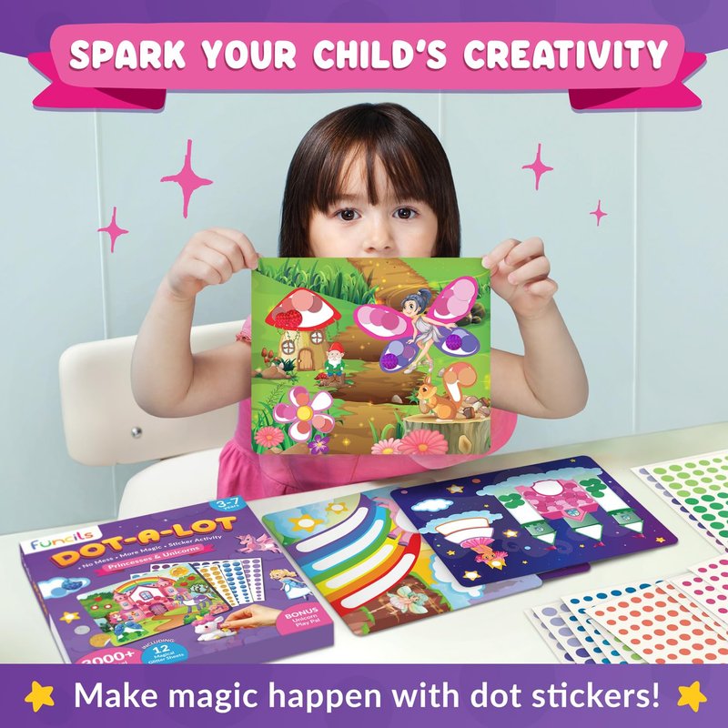 Funcils Dot Art Activity - Unicorn & Princess Sticker Art Kit, Toddler Arts & Crafts for Kids, Stocking Stuffers, Christmas Gifts for Boys & Girls Ages 3, 4, 5, 6, 7 Year Old - Travel Activities Toys
