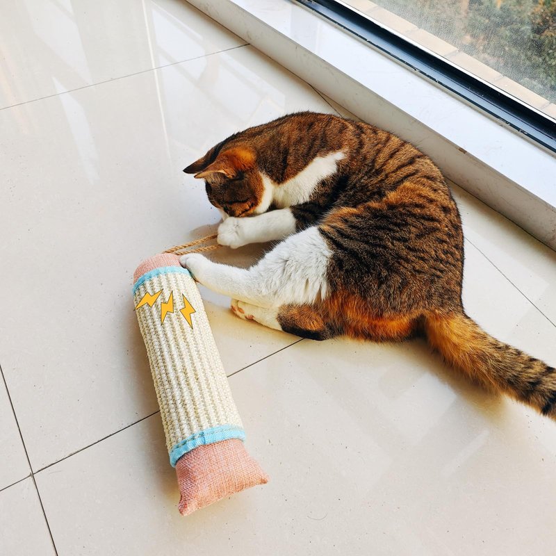 Cats like scratching, kicking, hunting, this handmade scratcher toy is made of natural sisal mat, and it makes sound when cats kicking it. This cat kicker toy is cute and interesting!