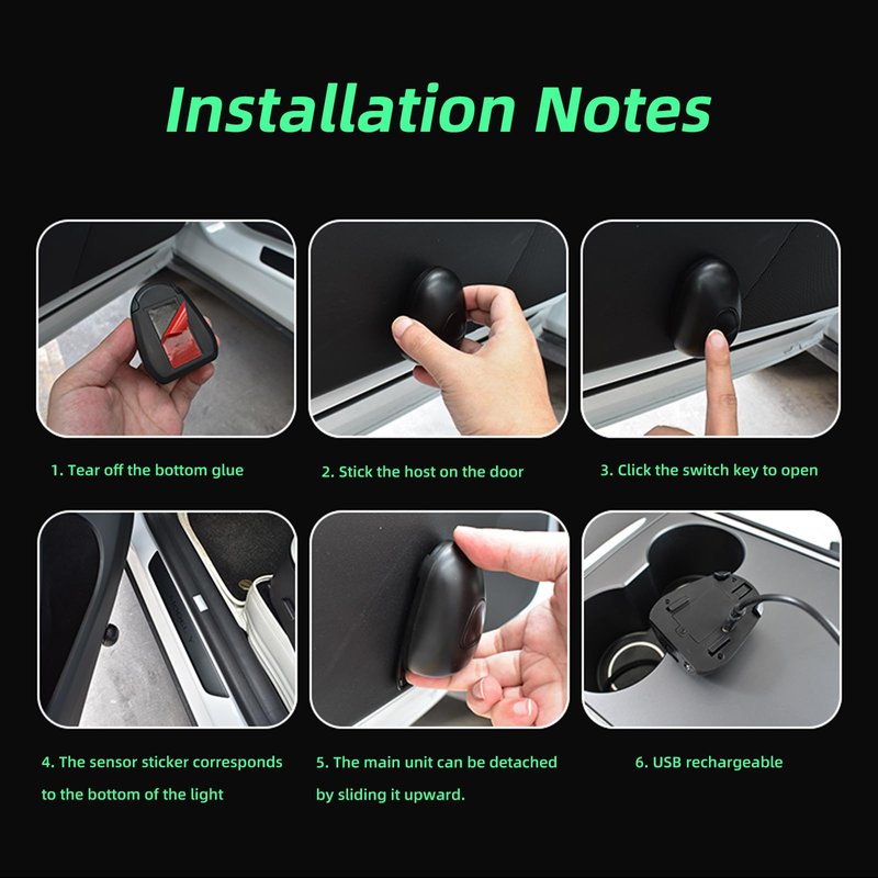 - Wireless Led welcome lights size: 8.5*8.5*3cm, suitable for all models, Accessories: Instructions + Adhesion Promoter + Infrared Sensing Sticker + USB Charging Cable