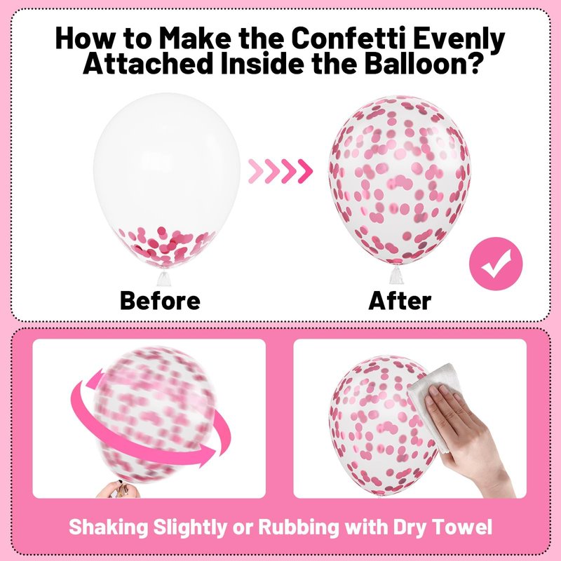 - WHAT YOU GET - This pink balloon set includes 60pcs 12-inch balloons. You will receive 15 x macaron pink balloons, 10 x metallic pink balloons, 15 x hot pink balloons, 15 x matte pink balloons, 5 x pink confetti balloons, along with 1 x 10m pink ribbon, 1 x 10m hot pink ribbon. With a size of 12 inches, they are the ideal addition to your decorating needs, leaving your guests with an unforgettable smile!