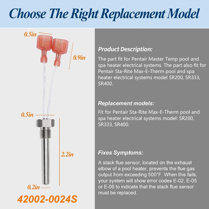 - 𝗨𝗡𝗜𝗩𝗘𝗥𝗦𝗔𝗟 𝗖𝗢𝗠𝗣𝗔𝗧𝗜𝗕𝗜𝗟𝗜𝗧𝗬 - 42002-0024S Stack Flue Sensor Replacement for Pentair MasterTemp pool and spa heater electrical systems, also fit for Pentair Sta-Rite Max-E-Therm pool and spa heater electrical systems model SR200, SR333, SR400.
