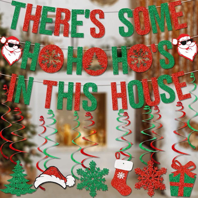 - 【What You Will Get】: 1 pcs red and green theres some ho ho hos in this house Banner, 6 pcs the christmas hanging swirl. The the funny christmas decorations provide everything you need to decorate your christmas party!