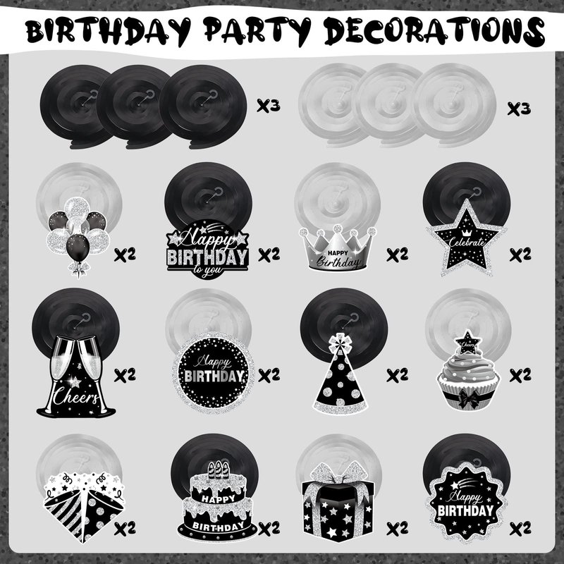 - Birthday Theme Design: these black silver happy birthday hanging cutouts are party themed in silver and black, with cute birthday present, hats, cakes, balloons, "Happy Birthday"and many more patterns, the birthday party ceiling sign decor is a perfect birthday party decoration to attract everyone's attention