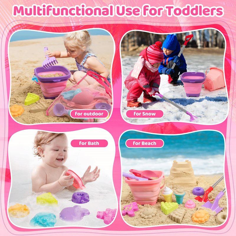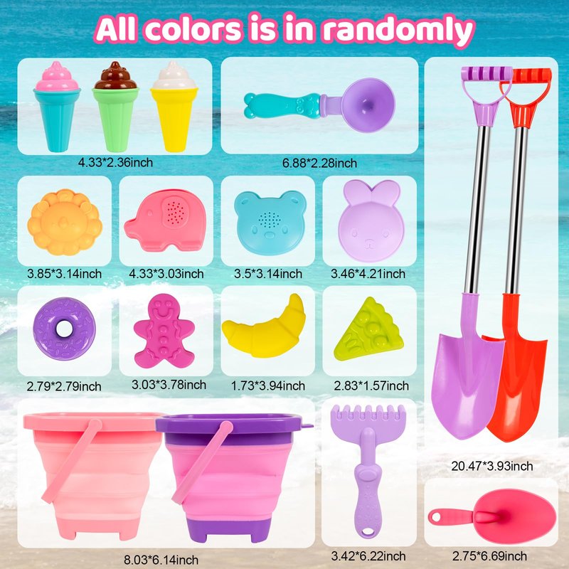 - 19 PCS BEACH SAND TOY SET—This comes with 2 X silicone foldable bucket,8 Pcs cute animal sand molds,3 X Ice cream molds 2 X Big shovel,3 X rake spoon tools, 1 X Mesh Bag for Storage. This travel beach toy is suitable for children and toddlers ages 3 +.
