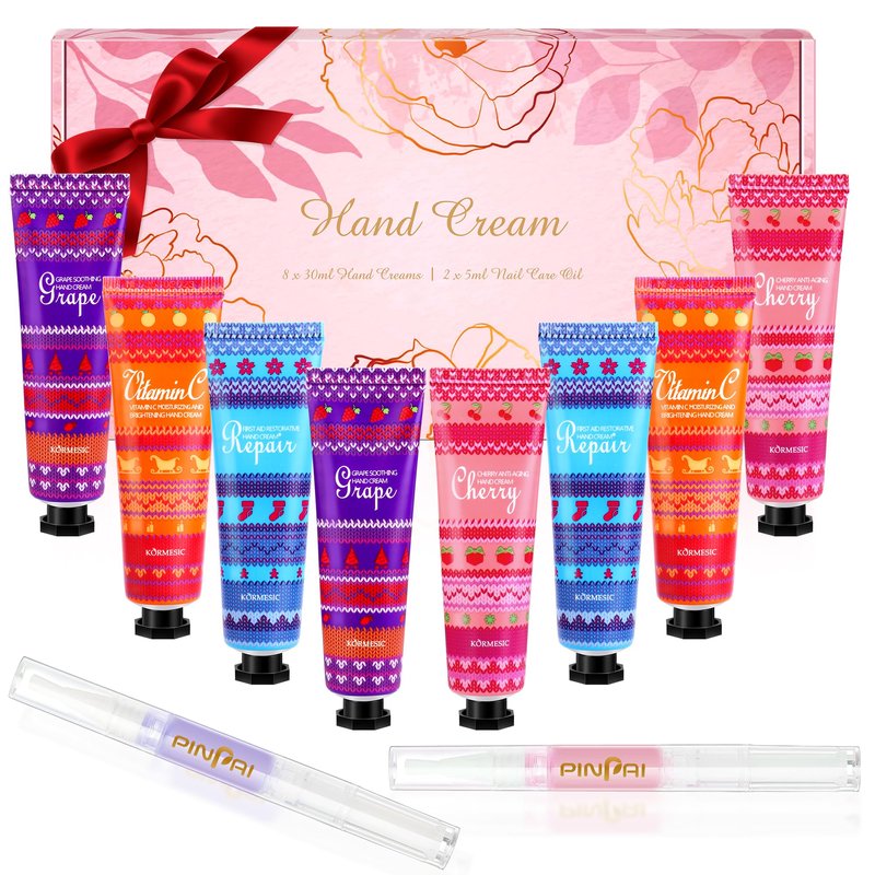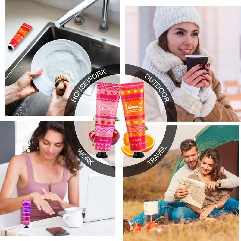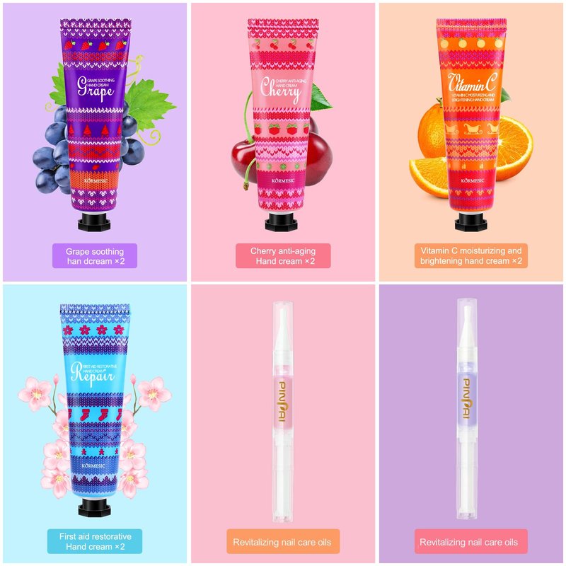 - 8 Pack hand cream set for women - 4 flavors to take good care of your delicate hands from different apects: grape for soothing, cherry for anti-aging, orange for vitamine C, ,the package also has 2PCS of nourishing nail care oil. Choose the suitable flavor based on your hand problems, enjoy the lush floral and fruity scent, and keep your hands and nails radiant.