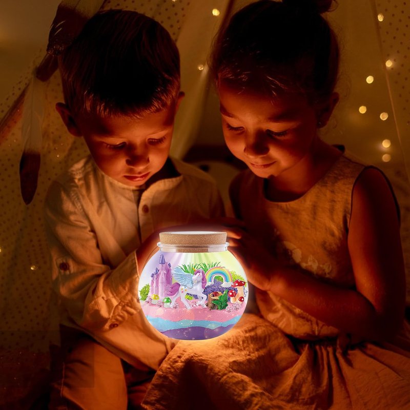 - Unicorn DIY Craft Kit: Our light up unicorn terrarium kit includes clear jars, 13-color LED night light with remote, unicorns, castles, rainbow, space sands, tree, flowers and more decorative accents. The accessories-rich set includes everything kids need to create a unicorn garden.