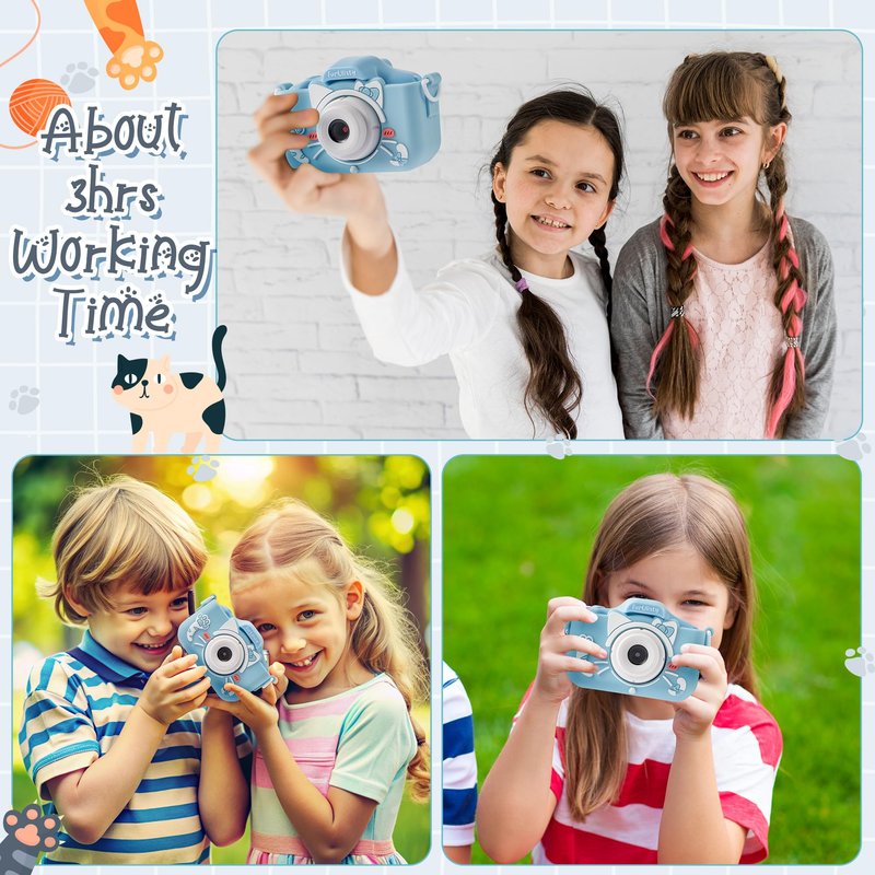 - Versatile Kids Camera Toys: Our cat camera toys has a superior battery capacity of 600mAh, offering an extended battery life of over 3 hours. It also comes with more functions include photo capture, video recording, playback, music player, game play setting, it has 5 different games for kids to bring more fun, kids can explore and record their surroundings through the camera