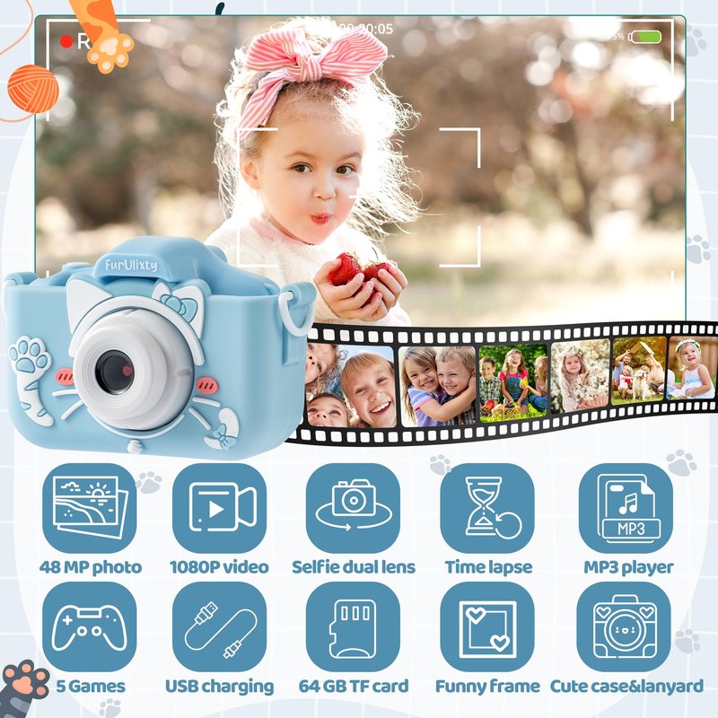 FurUlixty Upgraded Kids Camera Toys - Kids Digital Camera with Soft Silicone Cover, 1080P HD Selfie Video Camera for Boy Girl Toddler, with 64G SD Card, 3Hrs of Ultra-Long Battery Life (Azure Cat)
