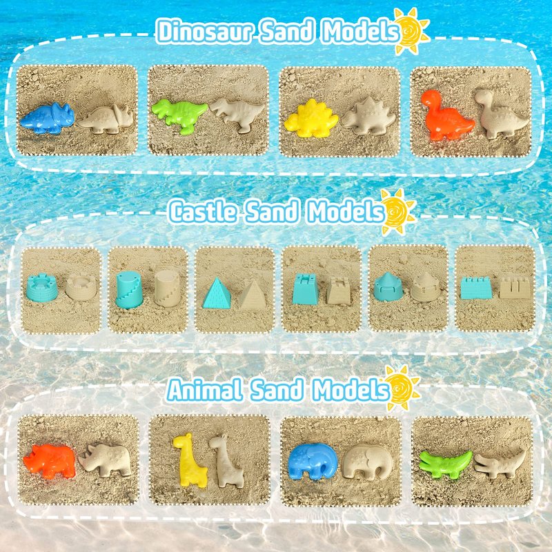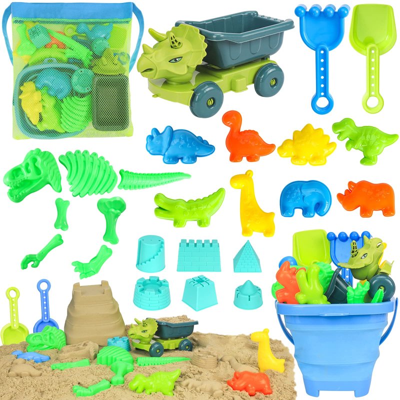 - Super Value Collapsible Beach Toys: The beach toys set includes 7×dinosaur fossil molds, 6×castle molds, 4×dinosaur molds, 4×animal molds, 1×collapsible beach bucket, 1×dinosaur dump truck toy, 1×mesh beach bag, 1×beach shovel, 1×beach rake. The sandbox toys for kids and toddlers help them have hours of fun in the summer. The dinosaur beach toys set is really a hit for dinos lovers