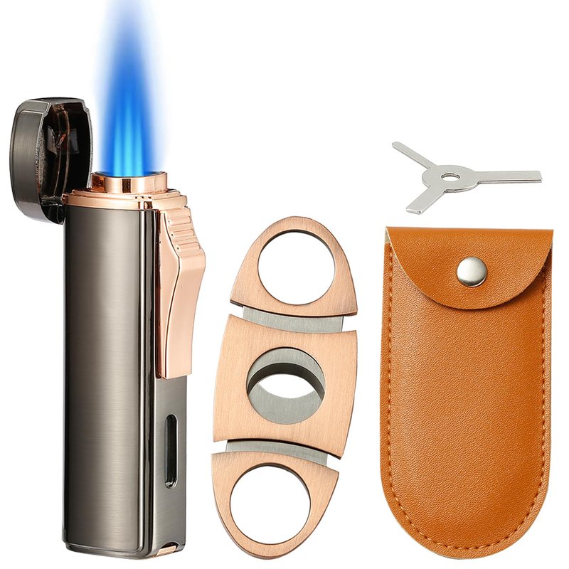 Futlidys 420 Carbon Steel ๐๐ฎ๐ญ๐ญ๐๐ซ and Torch Lighter Set, Built-in ๐๐ฎ๐ง๐๐ก, Triple Jet Flame Butane Lighter, Refillable Windproof Gas Lighter. Grey(Sold Without Gas)